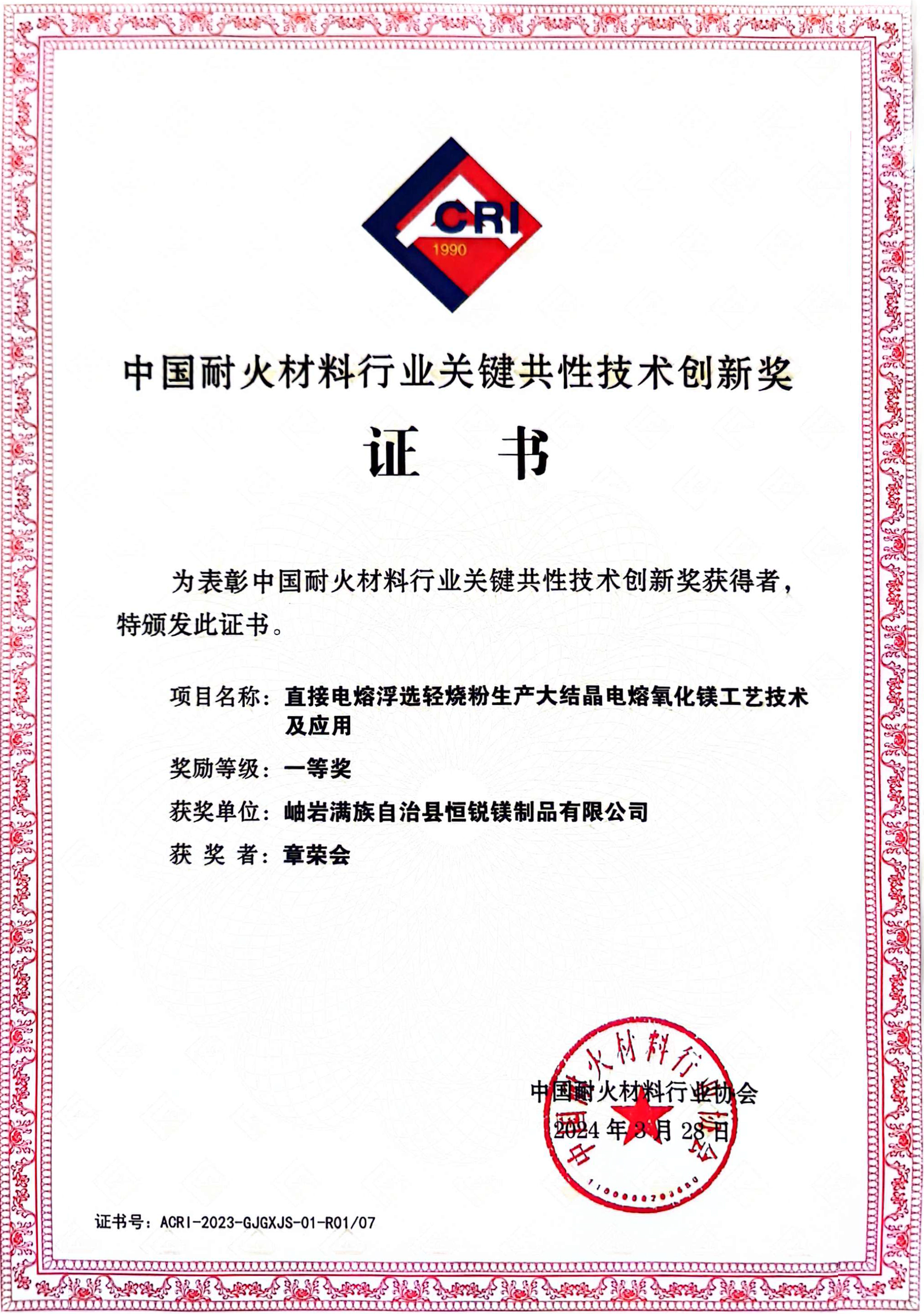 中國耐火材料行業(yè)關(guān)鍵共性技術(shù)創(chuàng)新獎(一等獎)