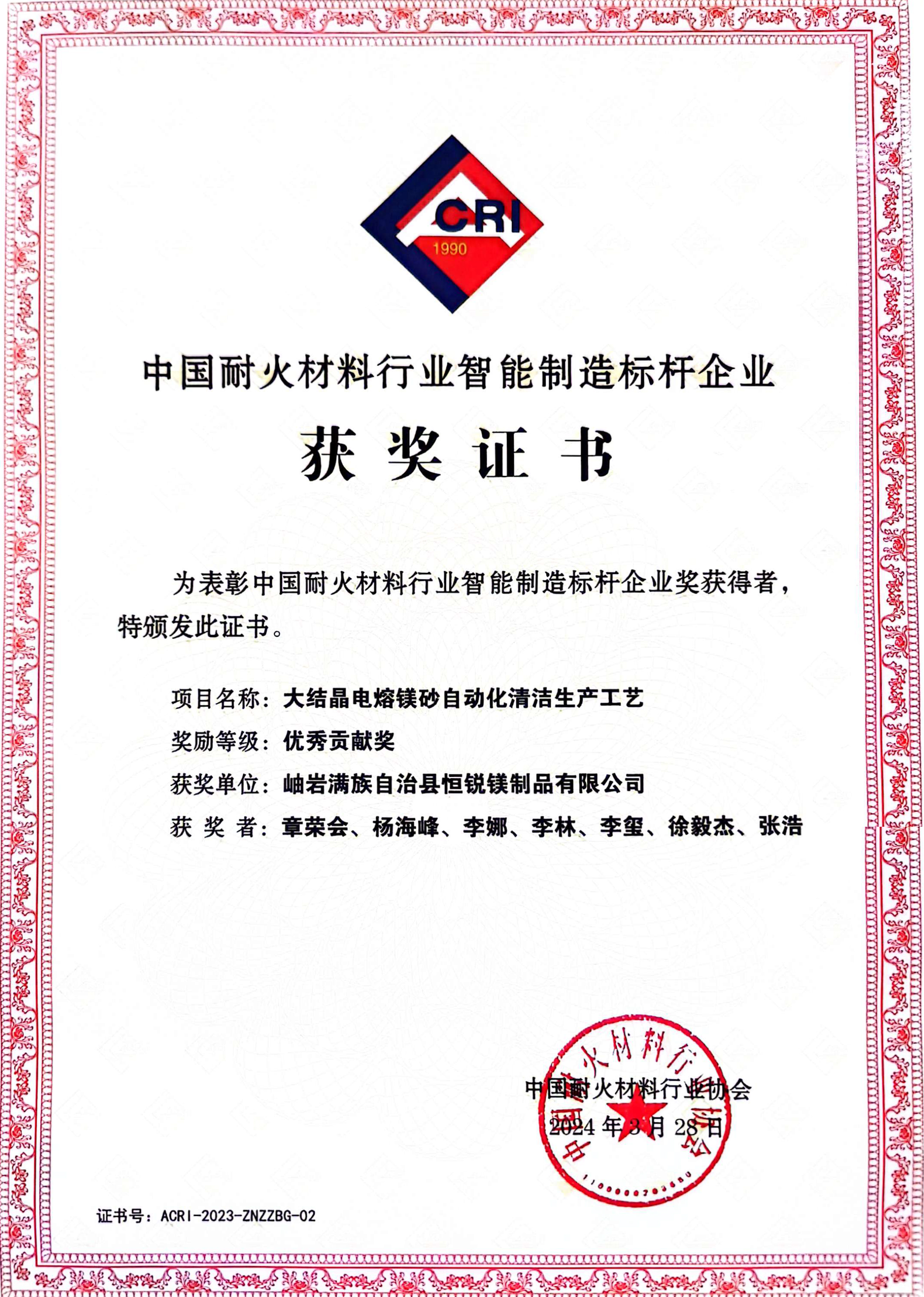 中國耐火材料行業(yè)智能制造標(biāo)桿企業(yè)(優(yōu)秀貢獻(xiàn)獎)
